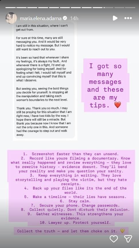 Former actress and model Ellen Adarna recently opened up about her personal experiences with a toxic relationship and responded to a follower seeking guidance on the matter by sharing ten practical tips. The advice came amid recent headlines involving allegations against her husband, actor Derek Ramsay, whom she accused of infidelity early in their marriage and refuted claims that he never cursed at her. Since speaking out, Ellen has received numerous messages from individuals relating to similar situations. One follower expressed gratitude for Ellen\'s courage in setting boundaries and confronting manipulation, stating, "But seeing you, seeing the bold things you decide for yourself. Stopping all the manipulation and taking each woman\'s boundaries to the next level. Thank you." In an Instagram story where she posted a screenshot of the message (omitting the sender\'s name), Ellen compiled a list of practical recommendations based on her experience: - Screenshot conversations before they can be deleted - Record interactions as if documenting them - Verify the actual events by reviewing information - Recognize attempts to rewrite history and rely on evidence - Be aware of gaslighting tactics that distort reality - Keep all communications in writing - Understand that manipulators often portray themselves as victims but detest documented proof - Backup important files diligently - Create a timeline to track inconsistencies and falsehoods - Maintain composure during confrontations - Secure personal devices and update passwords regularly - Discreetly collect evidence without provoking the other party - Gather witnesses to corroborate claims - Engage legal counsel to protect oneself "Collect the truth — and let them choke on it," Ellen declared in a follow-up story, adding, "See a therapist and build a strong support system. Healing is power." Ellen and Derek marked their fourth wedding anniversary on November 11. Their union has produced a daughter named Lili, and both partners have children from previous relationships.